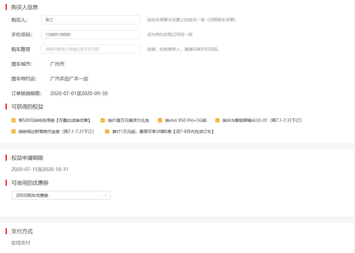 6、 准确填写购车人姓名、手机号码,手机号码用于接收购车凭证短信等重要信息,请确保信息准确性