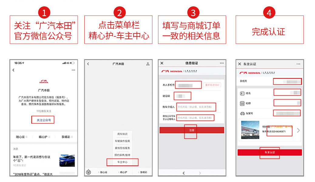 - 认证流程:关注“广汽本田”官方微信公众号—— 精心护——车主中心,填写与商城订单一致的购车人姓名、手机号码、车架号、特约店,完成认证;